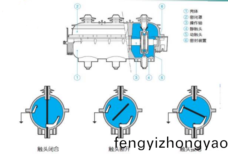開關採用SF6氣體滅弧,分閘(zha)時,觸(chu)頭斷開瞬間産生電弧,每(mei)相觸頭上的滅弧(hu)柵把電弧拉長分段(duan)冷卻,至電(dian)流過(guo)零時熄滅(mie)。