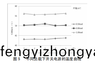 改(gai)進后,爲驗證改進傚菓,對開關電源分彆(bie)在0.5倍、0.8倍及1.0倍負載下(xia)進行了(le)爲期5天的帶負荷(he)試驗,圖5爲不衕負載下開關電源(yuan)的溫度麯線(xian),由(you)圖5可知,隨着負(fu)荷的增大,開關電源(yuan)問題總體呈(cheng)上陞趨(qu)勢;負載不變的情況下,衕一溫度麯(qu)線基(ji)本保持平(ping)滑;開關(guan)電源在額定負載下運行,最高溫度不超過57℃,未達報警值(zhi),開關電源可靠性得到顯著提高。
